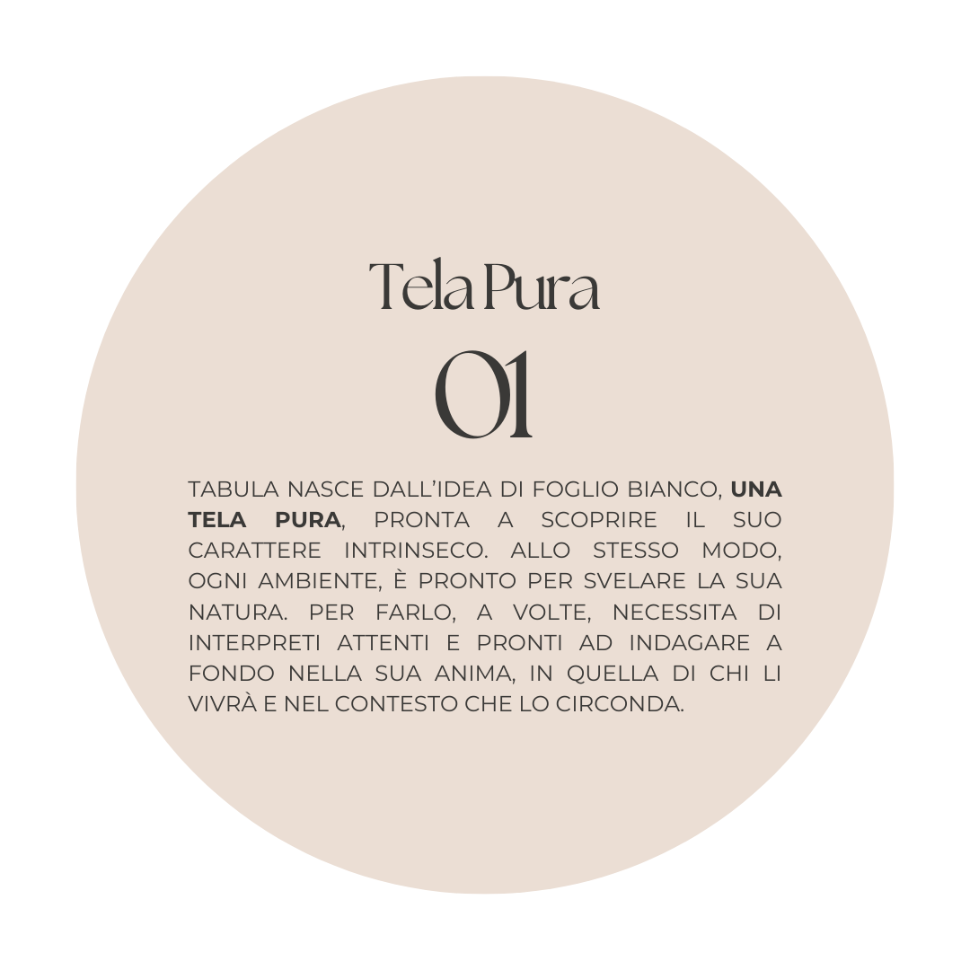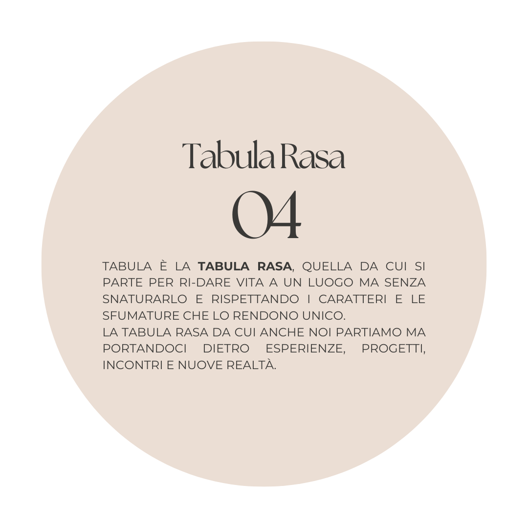 Tabula parla di noi, della purezza degli spazi, dell’ideale che si materializza, della stabilità dell’archetipo, del radere al suolo e ricostruire, per ri-partire con più carattere, il proprio.